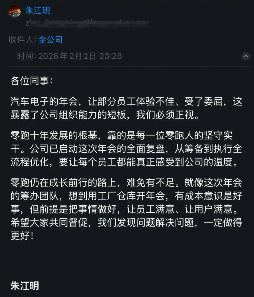 争议发酵后,零跑汽车管理层迅速作出回应。2月2日深夜,公司创始人、董事长朱江明发布内部信,承认年会让部分员工体验不佳、受了委屈,并表示将启动全面复盘。
